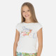 Camiseta de manga corta para chica. Cuello redondo. Suave tejido de algodón elástico. Elementos de adorno: dibujo en la parte delantera, tachuelas.