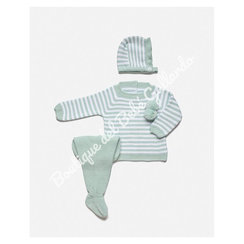 Conjunto punto bebé, verde agua, de Juliana 3 piezas. Jersey en color verde agua a rayas blancas, con dos grandes pompones. Polaina punto verde agua y gorro a juego.